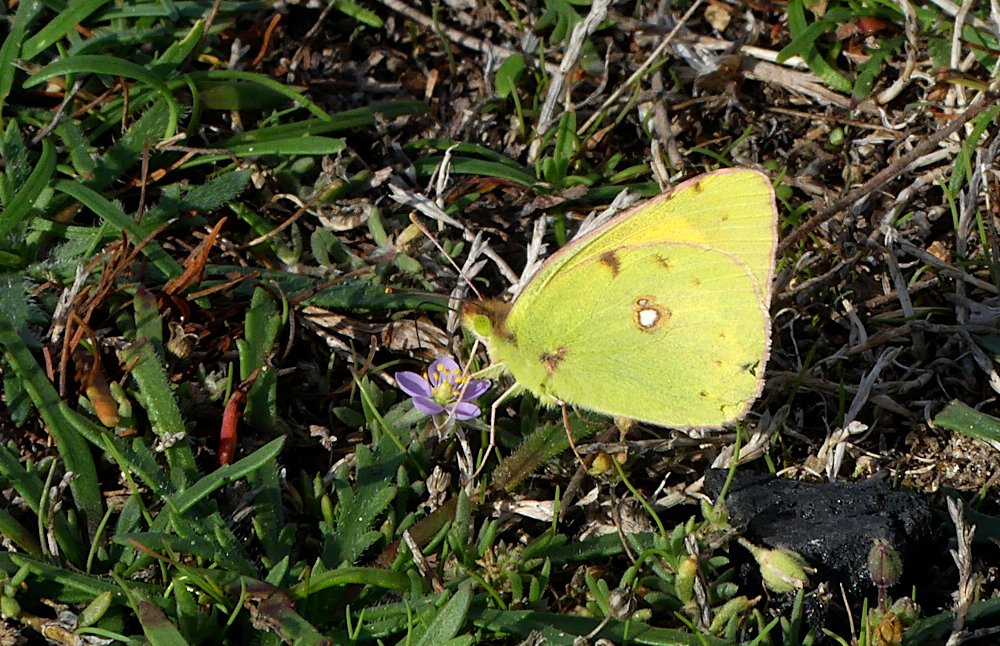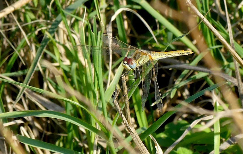 There was obviously some sort of minor influx of insects on 19th as I saw a Clouded Yellow feeding by the top car park at Pulias, and a darter by the pond there turned out to be a Red-veined Darter. I have finally managed to see this species after many years of looking for one. I was determined not to “twitch” any and was hoping to bump into one myself after quite a few close probables seen on the south cliffs at various times. This one though sat up on a stem and posed nicely, showing its bi-coloured blue and red eyes. My 6th new dragonfly species of the summer.