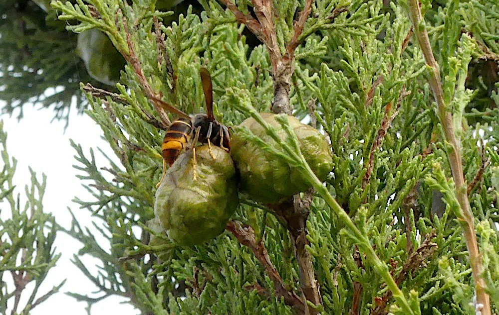 Another hymenopteran visitor to the garden was a single Asian Hornet seen on two different days, attracted to some sticky stuff emerging from the Cypress cones. Despite the species ‘invading’ the island, this was the first I have ever seen, which may mean the nest-finders/destroyers are doing a good job keeping them at bay. A few weeks after my sightings, a nest was removed from a tree in a lane only about 500m from the house, so it probably came from there.