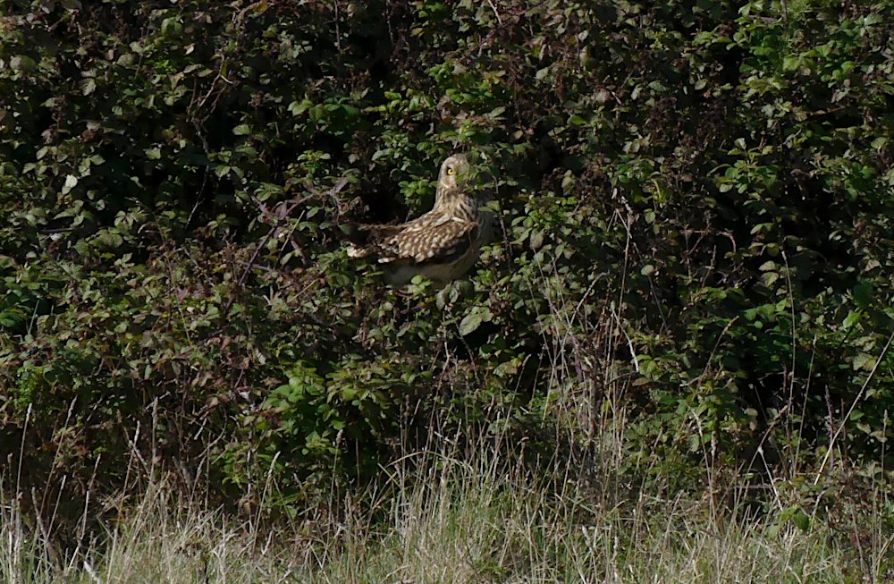 The odd migrant was picked up during the next few weeks, but it was pretty thin gruel. A Barn Owl flying through the garden after dark on 12th was the most interesting sighting, together with a flock of 4 Teals on the sea at Vazon on 23rd. Driving back from a weekend walk with Aidan on 28th, in the middle of a sunny afternoon, I picked up a flappy bird low over L’Ancresse Common, just behind the ice cream van. Despite the many people wandering around, the bird dropped into a bramble bush, and it turned out to be a superb Short-eared Owl. I managed a quick snap before it took flight, heading off north again pursued by crows. A most unexpected sighting.